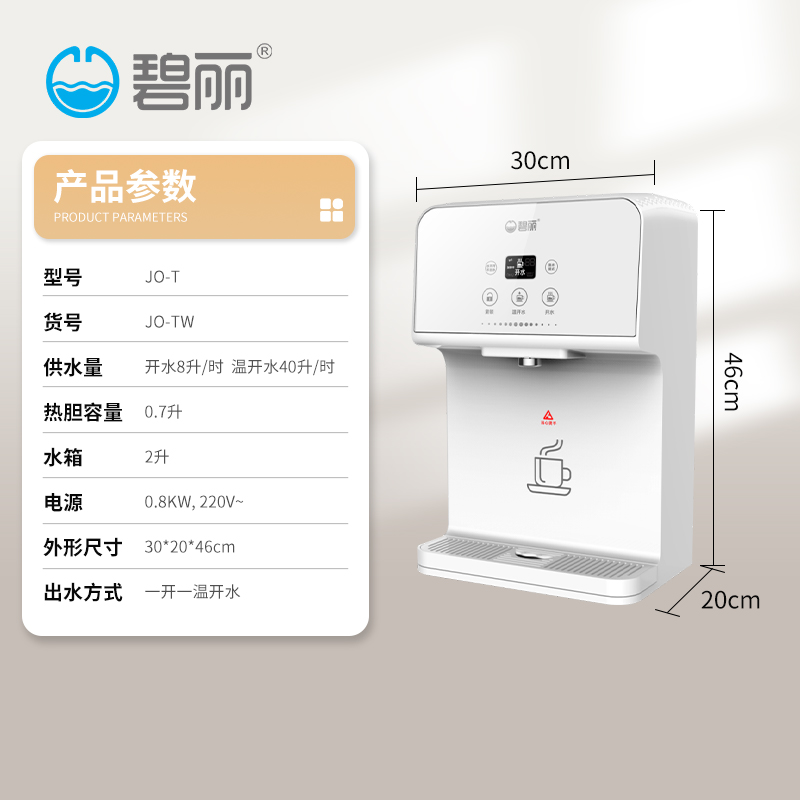 供 水 量:開水8升/時 溫開水40升/時功 率:0.8KW電 源:220V 50Hz~外形尺寸:30X20X46CM