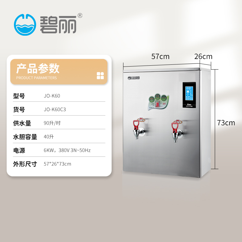 水膽容量:55升供 水 量:開水90升/時功 率:6KW電 源:220V 50HZ外形尺寸:52*26*73cm龍頭形式:開水